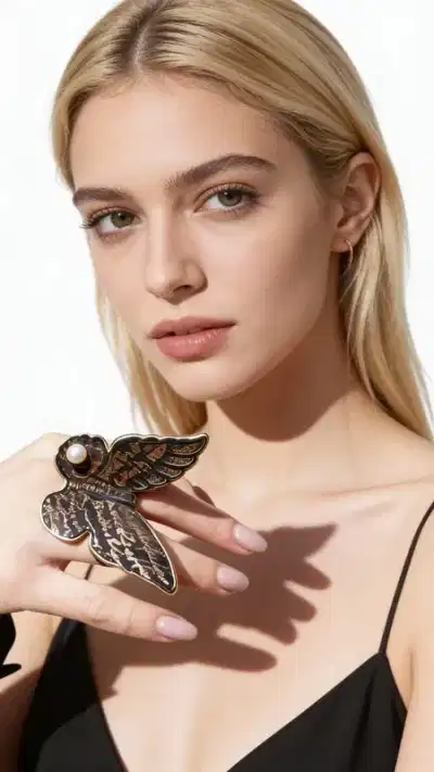 Ανακαλύψτε την τέλεια ισορροπία μεταξύ κλασικής κομψότητας και σύγχρονου design με αυτό το εντυπωσιακό statement δαχτυλίδι χειρόγραφο με μαργαριτάρι. Σχεδιασμένο από την Ελληνίδα Σχεδιάστρια Κοσμημάτων Αικατερίνη Χαλκιαδάκη, αυτό το μοναδικό κόσμημα συνδυάζει τη χειροποίητη τεχνοτροπία με καινοτόμα στοιχεία. Το δαχτυλίδι χαρακτηρίζεται από τη μαύρη βάση του με εκλεπτυσμένα χειρόγραφα μοτίβα που θυμίζουν αρχαία ελληνικά γράμματα και διακοσμητικά στοιχεία. Στο κέντρο της σύνθεσης, ένα λευκό μαργαριτάρι προσθέτει αίσθηση πολυτέλειας και φωτεινότητας, δημιουργώντας έναν εντυπωσιακό αντίθεση με το σκούρο φόντο. Τα φτερωτά μοτίβα και οι χρυσές λεπτομέρειες συμπληρώνουν τη σύνθεση, προσδίδοντας βάθος και κίνηση στο σχέδιο. Αυτό το εξαιρετικό κόσμημα είναι ιδανικό για γυναίκες που επιλέγουν μοναδικά αξεσουάρ και αγαπούν τα χειροποίητα κοσμήματα με ιστορία. Φροντίστε το δαχτυλίδι σας αποθηκεύοντάς το σε στεγνό μέρος και καθαρίζοντάς το απαλά με μαλακό πανί.