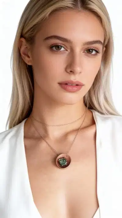 Το κολιέ διαθέτει μια εντυπωσιακή οβάλ πέτρα σιδηροπυρίτη σε υπέροχη σομόν απόχρωση, η οποία συνδυάζεται αρμονικά με τον ορείχαλκο. Η φυσική λάμψη του πυρίτη δημιουργεί παιχνίδια φωτός που προσδίδουν εκλεπτυσμένη αίσθηση στο κόσμημα. Η λεπτή αλυσίδα από ορείχαλκο ολοκληρώνει τον σχεδιασμό, προσφέροντας άνεση και κομψότητα.