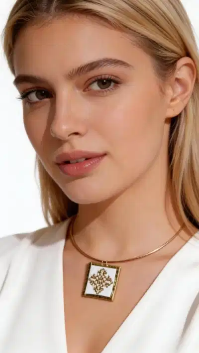 Κολιέ κεντητό άσπρο με γεωμετρικά σχέδια που συνδυάζει την παραδοσιακή τέχνη του κεντήματος με τη σύγχρονη αισθητική. Αυτό το εντυπωσιακό statement κολιέ, σχεδιασμένο από την Ελληνίδα Σχεδιάστρια Κοσμημάτων Αικατερίνη Χαλκιαδάκη, φέρει λεπτομερή γεωμετρικά μοτίβα κεντημένα με χρυσοκλωστή σε άσπρη βάση. Το χειροποίητο κολιέ διαθέτει τετράγωνο κεντητό στοιχείο που αποτελεί το κεντρικό σημείο του σχεδιασμού, δημιουργώντας έναν εκλεπτυσμένο συνδυασμό μίνιμαλ γραμμών και παραδοσιακής τεχνικής. Η χρυσή αλυσίδα από ορείχαλκο προσδίδει σύγχρονη πινελιά, ενώ το άσπρο χρώμα καθιστά το κολιέ ιδανικό για καθημερινές και ειδικές εμφανίσεις. Το μοναδικό αυτό κόσμημα αποτελεί τέλεια επιλογή για layering με άλλα κολιέ ή μπορεί να φορεθεί μόνο του ως statement αξεσουάρ. Συνδυάζεται υπέροχα με λευκά, μπεζ και χρυσαφί χρώματα, προσφέροντας ευελιξία στο styling. Υλικό: Ορείχαλκος, Ύφασμα Φροντίστε το κολιέ σας αποθηκεύοντάς το σε στεγνό μέρος και καθαρίζοντάς το απαλά με μαλακό πανί.