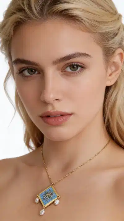 Ανακαλύψτε τη μαγεία του παραδοσιακού κεντήματος με αυτό το εξαιρετικό κολιέ κεντητό γαλάζιο που συνδυάζει αρμονικά την ελληνική παράδοση με τη σύγχρονη αισθητική. Σχεδιασμένο από την Ελληνίδα Σχεδιάστρια Κοσμημάτων Αικατερίνη Χαλκιαδάκη, το κόσμημα αυτό αποτελεί ένα μοναδικό statement piece που θα αναδείξει κάθε σας εμφάνιση. Το κεντητό pendant παρουσιάζει ένα γεωμετρικό σχέδιο με χρυσές λεπτομέρειες που δημιουργούν μια εντυπωσιακή σύνθεση στο γαλάζιο φόντο. Οι κομψές πέρλες που κρέμονται από το κάτω μέρος προσδίδουν κίνηση και elegance, ενώ η χρυσή αλυσίδα από ορείχαλκο συμπληρώνει τέλεια το συνολικό design. Το γαλάζιο χρώμα αποπνέει φρεσκάδα και είναι ιδανικό για καλοκαιρινές εμφανίσεις αλλά και για κομψά evening looks. Φροντίδα: Αποφύγετε την επαφή με νερό και αρώματα. Φυλάξτε σε στεγνό μέρος.