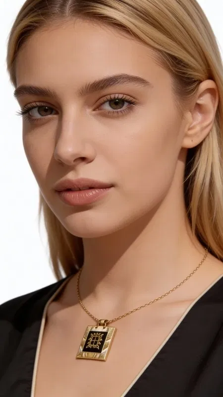 Το statement κολιέ παρουσιάζει μια τετράγωνη κεντητή επιφάνεια που πλαισιώνεται από χρυσό ορείχαλκο, ενώ το μαύρο υπόβαθρο αναδεικνύει τα χρυσά γεωμετρικά μοτίβα. Η τεχνική του κεντήματος προσδίδει υφή και βάθος στο σχέδιο, καθιστώντας το ιδανικό για γυναίκες που αναζητούν χειροποίητα κοσμήματα με ιδιαίτερη αισθητική.