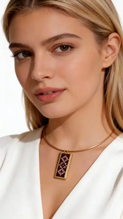 Ανακαλύψτε τη μοναδική ομορφιά του κεντητού κολιέ σε εντυπωσιακό μπορντό χρώμα με γεωμετρικά σχέδια από χρυσοκλωστή, σχεδιασμένο από την Ελληνίδα Σχεδιάστρια Κοσμημάτων Αικατερίνη Χαλκιαδάκη. Αυτό το εξαιρετικό χειροποίητο κόσμημα συνδυάζει την παραδοσιακή τέχνη του κεντήματος με σύγχρονη αισθητική, δημιουργώντας ένα statement κολιέ που θα κλέψει τις εντυπώσεις. Το κολιέ παρουσιάζει περίτεχνα γεωμετρικά μοτίβα κεντημένα με χρυσή κλωστή σε υπέροχο υπόβαθρο μπορντό, ενώ το κομψό δέσιμο από ορείχαλκο προσφέρει άνεση και στυλ. Η τέλεια ισορροπία ανάμεσα στην παραδοσιακή χειροτεχνία και το μοντέρνο design το καθιστά ιδανικό για κάθε περίσταση, από καθημερινές εμφανίσεις έως ειδικές στιγμές. Το κεντητό κοσμήματα αυτής της συλλογής αποτελεί την τέλεια επιλογή για γυναίκες που αγαπούν τα γυναικεία κολιέ με χαρακτήρα και ιδιαίτερο στυλ. Συνδυάστε το με μονόχρωμα outfits για να αναδείξετε την ομορφιά του ή δημιουργήστε layering εμφανίσεις με άλλα κοσμήματα. Φροντίστε το κολιέ σας αποθηκεύοντάς το σε στεγνό μέρος και αποφεύγοντας την επαφή με νερό για μεγαλύτερη διάρκεια ζωής. Υλικό: Ορείχαλκος, Ύφασμα
