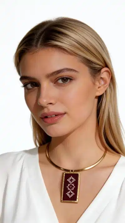 Ανακαλύψτε τη μαγεία της παραδοσιακής ελληνικής τέχνης με αυτό το μοναδικό κεντητό κολιέ σε μπορντό απόχρωση. Σχεδιασμένο από την Ελληνίδα Σχεδιάστρια Κοσμημάτων Αικατερίνη Χαλκιαδάκη, αυτό το εντυπωσιακό statement κολιέ συνδυάζει την κομψότητα του χρυσοκλωστού κεντήματος με τη μοντέρνα αισθητική. Το κολιέ διαθέτει γεωμετρικά σχέδια κεντημένα με χρυσοκλωστή σε βαθιά μπορντό βάση, δημιουργώντας έναν εκπληκτικό συνδυασμό χρωμάτων που προσελκύει τα βλέμματα. Η λεπτομερής χειροτεχνία και το κεντητό μοτίβο τονίζουν την παραδοσιακή ελληνική κουλτούρα με σύγχρονη πινελιά. Ιδανικό για γυναίκες που αγαπούν τα χειροποίητα κοσμήματα με ιστορία, αυτό το κολιέ συμπληρώνει τέλεια τόσο καθημερινά όσο και επίσημα σύνολα. Το ορείχαλκινο choker στυλ δέσιμο προσφέρει άνετη εφαρμογή και κομψή εμφάνιση. Το κεντητό κολιέ φροντίζεται εύκολα με απαλό καθάρισμα και φύλαξη σε στεγνό μέρος. Ένα μοναδικό κομμάτι που εκφράζει την προσωπικότητά σας με ελληνική κομψότητα. Υλικό: Ορείχαλκος, Ύφασμα