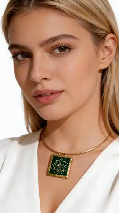 Ανακαλύψτε τη μαγεία του κεντητού κολιέ που συνδυάζει την παραδοσιακή τέχνη του κεντήματος με σύγχρονο design. Αυτό το εντυπωσιακό κολιέ κεντητό πράσινο με γεωμετρικά σχέδια από χρυσοκλωστή, σχεδιασμένο από την Ελληνίδα Σχεδιάστρια Κοσμημάτων Αικατερίνη Χαλκιαδάκη, αποτελεί ένα μοναδικό κόσμημα που θα μεταμορφώσει κάθε σας εμφάνιση. Το statement κολιέ διαθέτει τετράγωνη φόρμα με περίτεχνα γεωμετρικά μοτίβα κεντημένα με χρυσή κλωστή πάνω σε πράσινο υπόβαθρο. Η χρυσή αλυσίδα από ορείχαλκο προσδίδει κομψότητα, ενώ το χειροποίητο κέντημα δημιουργεί μια μοναδική υφή που τραβάει τα βλέμματα. Το folk design με τα χρυσά σχέδια δημιουργεί ένα εντυπωσιακό contrast που αναδεικνύει τη θηλυκότητα. Ιδανικό για layering με άλλα κολιέ ή μόνο του ως statement piece, συνδυάζεται τέλεια με λευκά tops, φορέματα και casual ή elegant looks. Η μοναδική αισθητική του το καθιστά αυθεντικό greek jewelry που φέρει την υπογραφή της ελληνικής χειροτεχνίας. Υλικό: Ορείχαλκος, Ύφασμα Φυλάσσετε το κολιέ σε στεγνό μέρος και αποφεύγετε την επαφή με νερό για να διατηρήσετε το κέντημα σε άριστη κατάσταση.