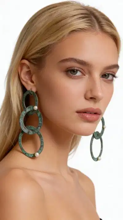 Ανακαλύψτε τη μαγεία των μεγάλων εντυπωσιακών σκουλαρικιών που συνδυάζουν την κομψότητα του χαλκού με την πράσινη πατίνα σε ένα μοναδικό design. Αυτά τα χειροποίητα μακριά καρφωτά σκουλαρίκια, σχεδιασμένα από την Ελληνίδα Σχεδιάστρια Κοσμημάτων Αικατερίνη Χαλκιαδάκη, δημιουργούν statement look που προσελκύει τα βλέμματα. Το innovative design με τους αλληλένδετους κρίκους σε πράσινη πατίνα δίνει bohemian αισθητική που ταιριάζει τέλεια σε σύγχρονες γυναίκες. Κάθε κρίκος είναι χειροτεχνημένος από υψηλής ποιότητας χαλκό και διακοσμημένος με φυσικά μαργαριτάρια που προσθέτουν λάμψη και κομψότητα. Η μοναδική πράσινη πατίνα δημιουργεί vintage αίσθηση που συνδυάζεται άψογα με μοντέρνα και κλασικά outfits. Τα κρεμαστά σκουλαρίκια αυτά είναι ιδανικά για ιδιαίτερες στιγμές, νυφικές εμφανίσεις ή everyday chic looks. Η ελληνική τεχνογνωσία φαίνεται σε κάθε λεπτομέρεια, από την τέλεια ισορροπία των κρίκων μέχρι την προσεκτική τοποθέτηση των περλών. Φυλάξτε τα σε στεγνό μέρος και καθαρίστε τα απαλά με μαλακό πανί.