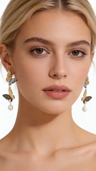 Τα εντυπωσιακά σκουλαρίκια πεταλούδα με μαργαριτάρια αποτελούν ένα μοναδικό κόσμημα που συνδυάζει τη φυσική ομορφιά με την καλλιτεχνική δημιουργία. Σχεδιασμένα από την Ελληνίδα Σχεδιάστρια Κοσμημάτων Αικατερίνη Χαλκιαδάκη, αυτά τα χειροποίητα σκουλαρίκια αποτυπώνουν την κομψότητα της πεταλούδας σε έναν πρωτότυπο σχεδιασμό που αιχμαλωτίζει το βλέμμα. Κατασκευασμένα από υψηλής ποιότητας ορείχαλκο με μαύρη πατίνα, τα σκουλαρίκια διαθέτουν διπλό σχήμα πεταλούδας που δημιουργεί μια εκπληκτική οπτική ισορροπία. Τα φυσικά μαργαριτάρια προσθέτουν μια τελειοποιητική πινελιά λάμψης, ενώ οι χρυσαφί αποχρώσεις δίνουν ζεστασιά στο σύνολο. Το κρεμαστό σχήμα και το μεγάλο μέγεθος τα καθιστούν ιδανικά για γάμους, βραδινές εξόδους ή ειδικές περιστάσεις.