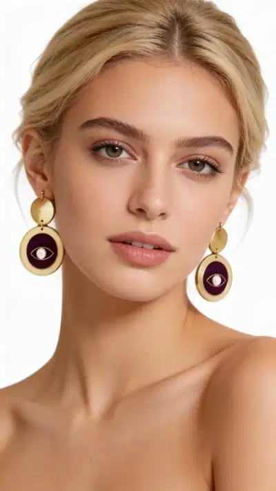 Ανακαλύψτε τη μαγεία του evil eye με αυτά τα εντυπωσιακά χειροποίητα σκουλαρίκια που συνδυάζουν παραδοσιακή προστασία με μοντέρνο στυλ. Κάθε ζευγάρι σκουλαρικιών evil eye, σχεδιασμένο από την Ελληνίδα Σχεδιάστρια Κοσμημάτων Αικατερίνη Χαλκιαδάκη, αποτελεί μια μοναδική δημιουργία που ενώνει τη σύγχρονη αισθητική με την αρχαία ελληνική παράδοση. Τα κρεμαστά σκουλαρίκια διαθέτουν δύο κομψούς κύκλους από ξύλο σε χρυσαφένια απόχρωση, με το κάτω τμήμα να φέρει εντυπωσιακό evil eye σε βαθύ μοβ χρώμα και λευκή πέρλα στο κέντρο. Η γεωμετρική σύνθεση και η αντίθεση των χρωμάτων δημιουργούν ένα statement κόσμημα που προσελκύει τα βλέμματα.
