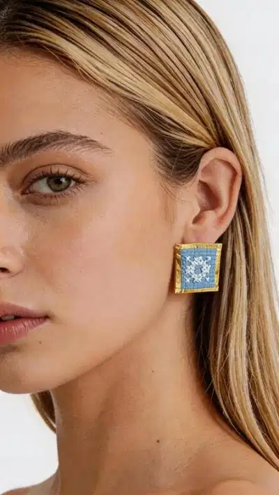 Τα statement κεντητά σκουλαρίκια με γεωμετρικά σχέδια σε γαλάζιο χρώμα θα προσδώσουν έναν μοναδικό χαρακτήρα σε κάθε σας εμφάνιση. Αυτά τα εντυπωσιακά χειροποίητα σκουλαρίκια, σχεδιασμένα από την Ελληνίδα Σχεδιάστρια Κοσμημάτων Αικατερίνη Χαλκιαδάκη, συνδυάζουν την παραδοσιακή τέχνη του κεντήματος με σύγχρονο γεωμετρικό design. Η χρυσοκλωστή που πλαισιώνει το κεντημένο γαλάζιο ύφασμα δημιουργεί μια εκλεπτυσμένη αντίθεση που τραβά τα βλέμματα. Το τετράγωνο σχήμα με τα folklore κεντήματα αναδεικνύει την ελληνική παράδοση σε μοντέρνα αισθητική. Κάθε σκουλαρίκι είναι χειροποίητο με ιδιαίτερη προσοχή στη λεπτομέρεια, εγγυώμενο την υψηλή ποιότητα και τη μοναδικότητα του κομματιού. Ιδανικά για εντυπωσιακές εμφανίσεις, γαμήλιες εκδηλώσεις ή καθημερινό styling που θέλει να ξεχωρίσει. Συνδυάζονται τέλεια με boho outfits, κλασικά φορέματα και σύγχρονα casual looks. Υλικό: Ορείχαλκος, Ύφασμα Φροντίστε τα με απαλό καθάρισμα και αποθηκεύστε τα σε στεγνό μέρος για να διατηρήσουν τη λάμψη τους.