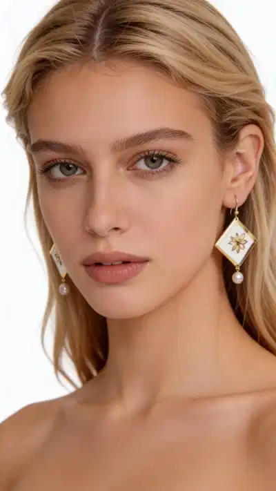 Κάθε σκουλαρίκι διακοσμείται με γεωμετρικό κέντημα από χρυσοκλωστή πάνω σε λευκή βάση, ενώ ολοκληρώνεται με κομψή πέρλα που κρέμεται στο κάτω μέρος. Η ρομβοειδής φόρμα με τη χρυσή αστεροειδή διακόσμηση προσδίδει μοντέρνα αισθητική, καθιστώντας το ιδανικό για ιδιαίτερες στιγμές και επίσημες εμφανίσεις.