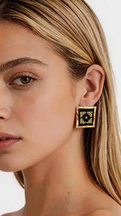 Ξεχωρίστε με αυτά τα εντυπωσιακά statement κεντητά σκουλαρίκια που συνδυάζουν την παραδοσιακή ελληνική τέχνη του κεντήματος με σύγχρονο γεωμετρικό design. Σχεδιασμένα από την Ελληνίδα Σχεδιάστρια Κοσμημάτων Αικατερίνη Χαλκιαδάκη, αυτά τα μοναδικά χειροποίητα σκουλαρίκια φέρουν έναν πλούσιο χρυσόκλωστο κεντητό σχεδιασμό πάνω σε κομψό μαύρο φόντο. Κάθε σκουλαρίκι αποτελεί ένα μικρό έργο τέχνης με περίπλοκα γεωμετρικά μοτίβα που δημιουργούν μια εκπληκτική οπτική αίσθηση. Η χρυσή κλωστή λάμπει υπέροχα πάνω στη μαύρη βάση, προσφέροντας έναν εντυπωσιακό συνδυασμό που ταιριάζει τόσο σε καθημερινές όσο και σε επίσημες εμφανίσεις. Αυτά τα μοντέρνα κρεμαστά σκουλαρίκια είναι ιδανικά για γυναίκες που αγαπούν τα πρωτότυπα κοσμήματα με ελληνικό χαρακτήρα. Το τετράγωνο σχήμα τους προσφέρει μια σύγχρονη αισθητική, ενώ η κεντητή λεπτομέρεια φέρνει την παράδοση στο προσκήνιο. Υλικό: Ορείχαλκος, Ύφασμα Φροντίστε τα σκουλαρίκια σας αποθηκεύοντάς τα σε στεγνό μέρος και αποφεύγοντας την επαφή με υγρασία και χημικά προϊόντα.
